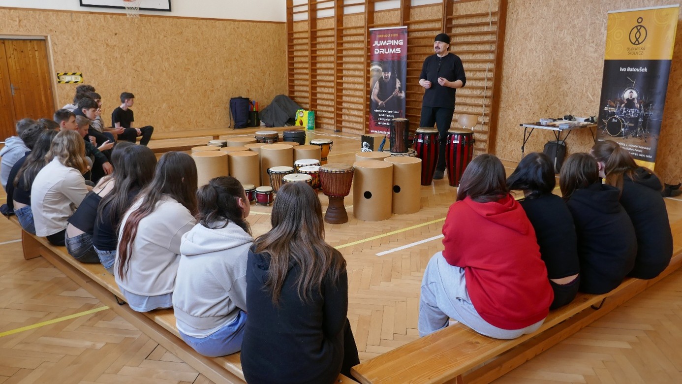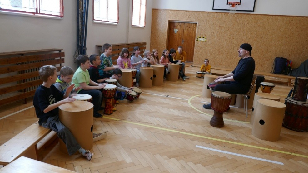 Po krátkém seznámení s lektorem proběhla strhující ukázka hry na africký buben djembe, která motivovala žáky k seznámení se s hudebními nástroji a jejich výběru pro vlastní hru. Každý účastník měl možnost naučit se bubnovat jednoduchou rytmickou rozcvičku a později jednoduchou rytmickou skladbu. Lektor dokázal dobře přizpůsobit program různým věkovým kategoriím.